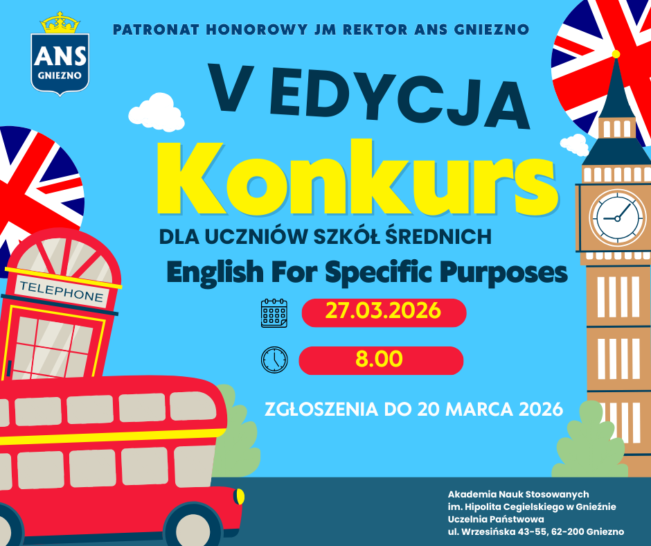 Serdecznie zapraszamy uczniów szkół średnich do wzięcia udziału w III edycji konkursu English for Specific Purposes, który odbędzie się 4 kwietnia br. o godz. 13:00 w kampusie akademickim Akademii Nauk Stosowanych im. H. Cegielskiego... czytaj więcej