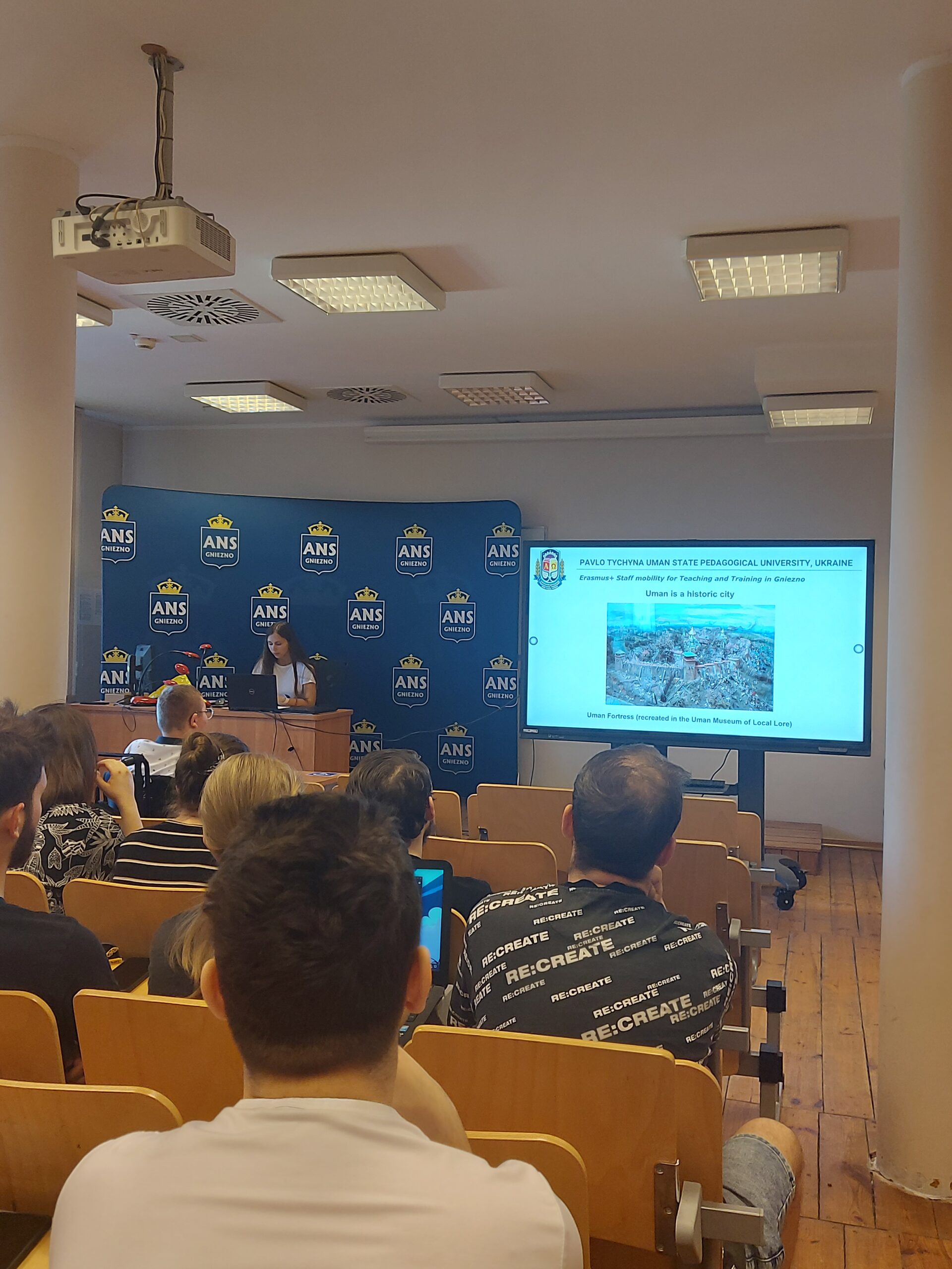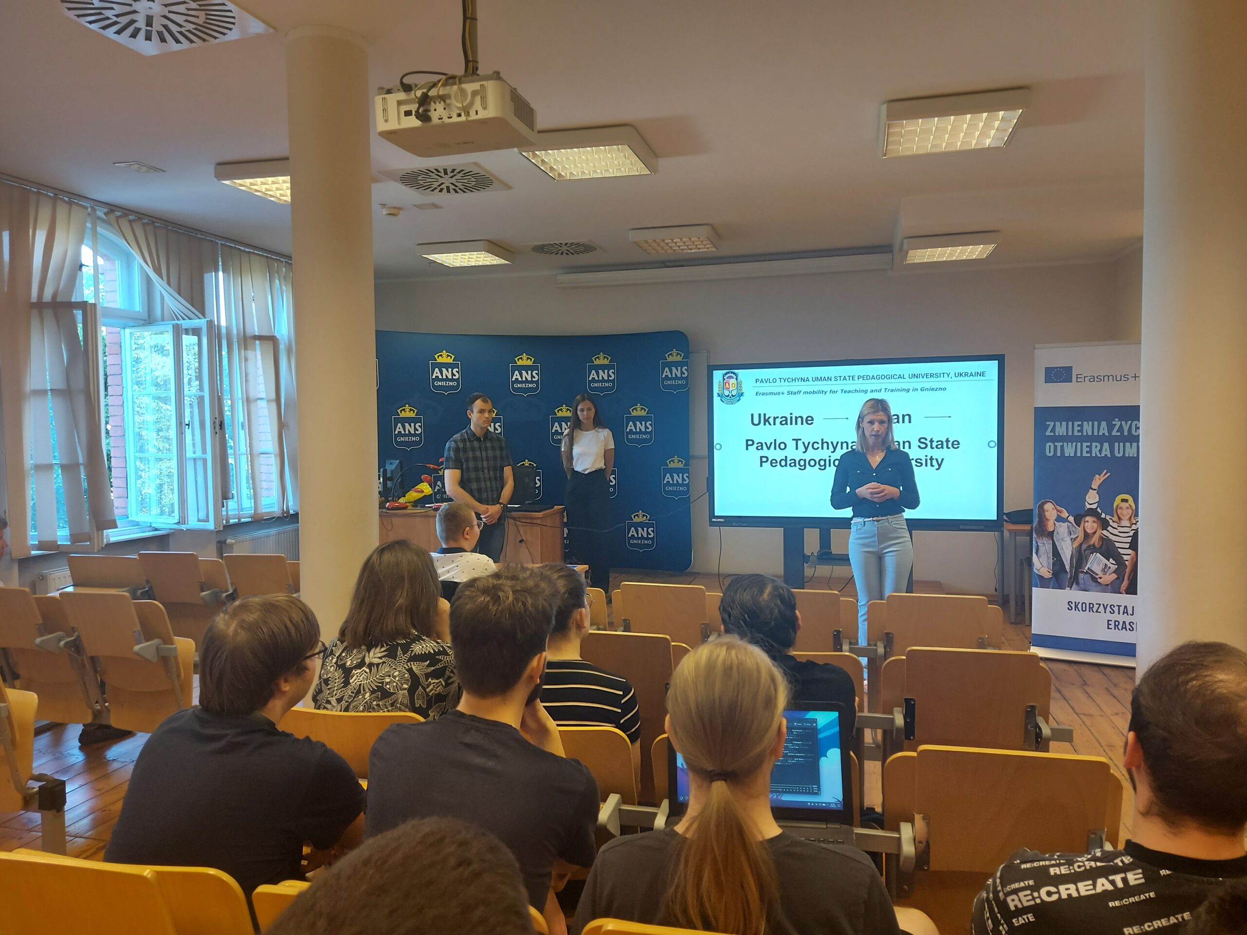 Nasi goście, wykładowcy kierunku Informatyka z ukraińskiego Państwowego Uniwersytetu Pedagogicznego im. Pawła Tyczyny w Humaniu, którzy przebywają u nas na takiej mobilności, 22 maja poprowadzili pierwszy wykład dla studentów w ANS Gniezno. Uczestnicy mogli wysłuchać m.in. prezentacji o uniwersytecie naszych gości, podstawowych założeń i analiz zagrożeń informatycznych, wirusach komputerowych, roli sztucznej inteligencji w edukacji.