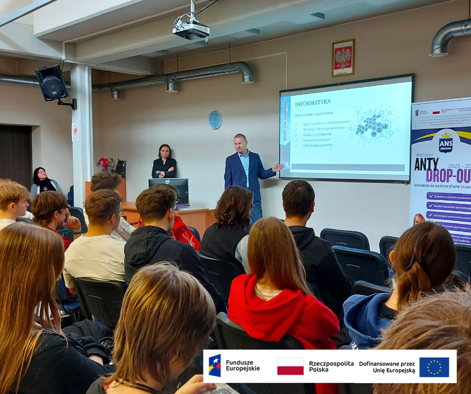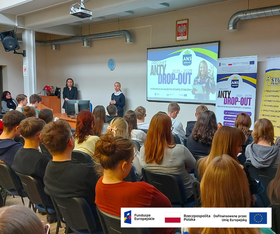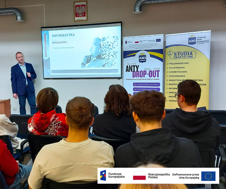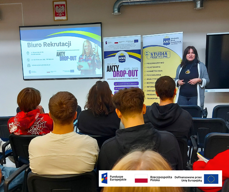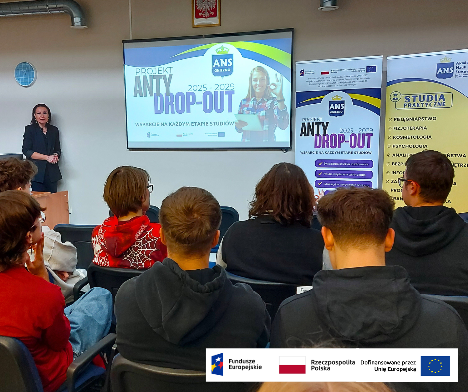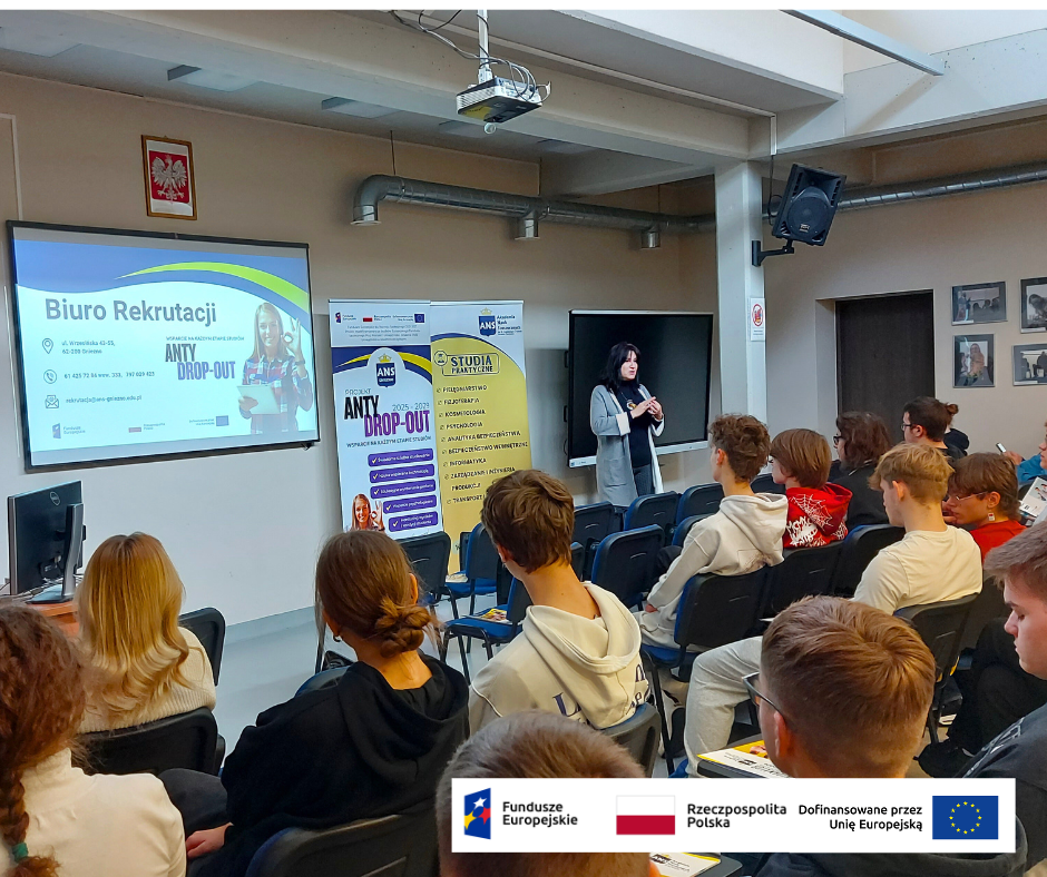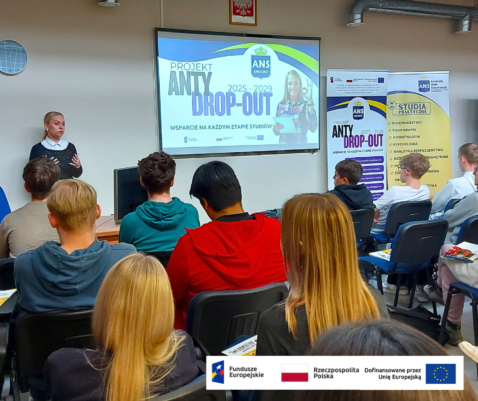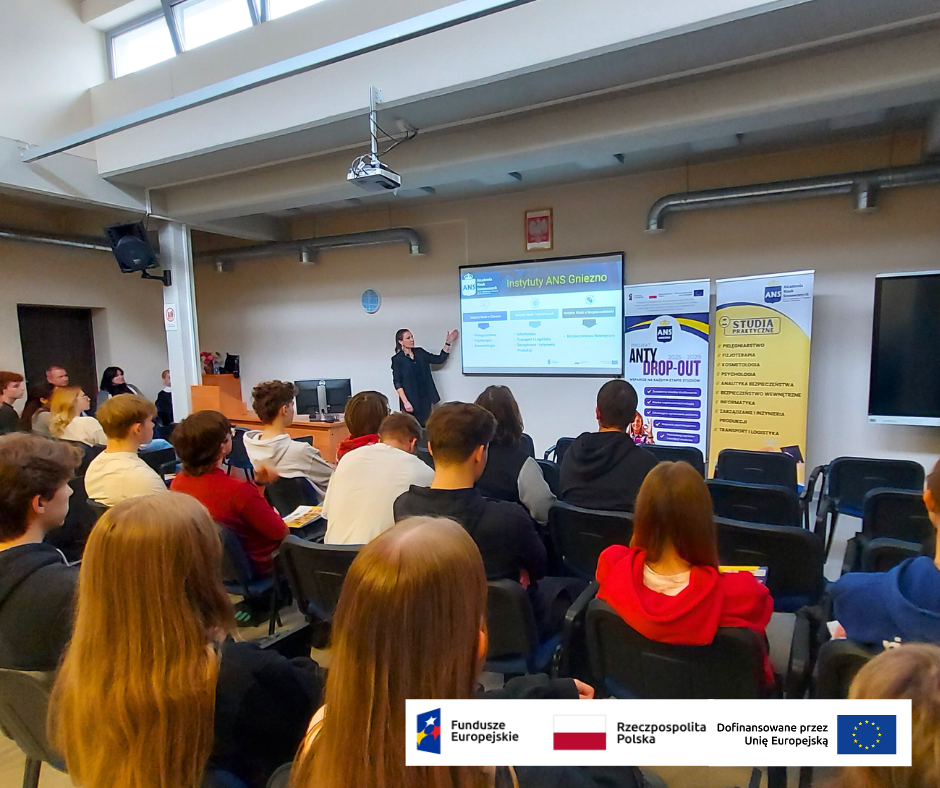 Podczas prezentacji młodzież mogła szczegółowo zapoznać się z możliwościami rozwoju, jakie oferuje ANS Gniezno. Przedstawiono m.in. programy mentoringowe wspierające studentów na każdym etapie kształcenia, szeroki system stypendialny obejmujący zarówno stypendia motywacyjne, jak i socjalne, a także inne formy wsparcia edukacyjnego i organizacyjnego, które ułatwiają adaptację do środowiska akademickiego oraz pomagają w budowaniu kompetencji potrzebnych na współczesnym rynku pracy. Uczniowie dowiedzieli się również o zajęciach praktycznych, nowoczesnej infrastrukturze dydaktycznej oraz współpracy uczelni z lokalnymi pracodawcami.